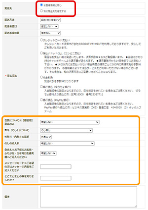 発送先が送り主と違う場合「発送先」のチェックを「別の発送先を指定する」に入れると、発送先のお客様情報を入力できるようになりますので、そちらにご記入ください。 配送方法・希望日・希望時間について配送方法は「通常配送」となります。 配送希望時間を6種類から選択いただけます。 支払方法についてお支払方法は、「代金引換」「銀行振込」「クレジットカード支払い」がお選びいただけます。 のし・メッセージカードについてのしをご希望の方は、のしの種類をご選択ください。また、名入れをすることができます。ご希望の方は「希望する」を選択後、備考欄へ記載するお名前を入力下さい。 メッセージカードをご希望の方は、入力欄または備考欄へメッセージをご記入ください。 |